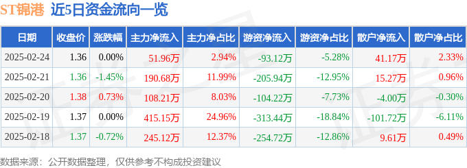 证券之星消息,截至2025年2月24日收盘,ST锦港(600190)报收于1.36元,上涨0.0%,换手率0.73%,成交量13.0万手,成交额1765.13万元。