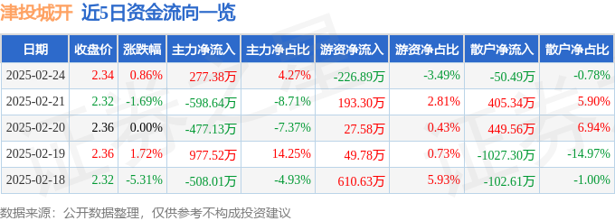 2月24日的资金流向数据方面,主力资金净流入277.38万元,占总成交额4.27%,游资资金净流出226.89万元,占总成交额3.49%,散户资金净流出50.49万元,占总成交额0.78%。