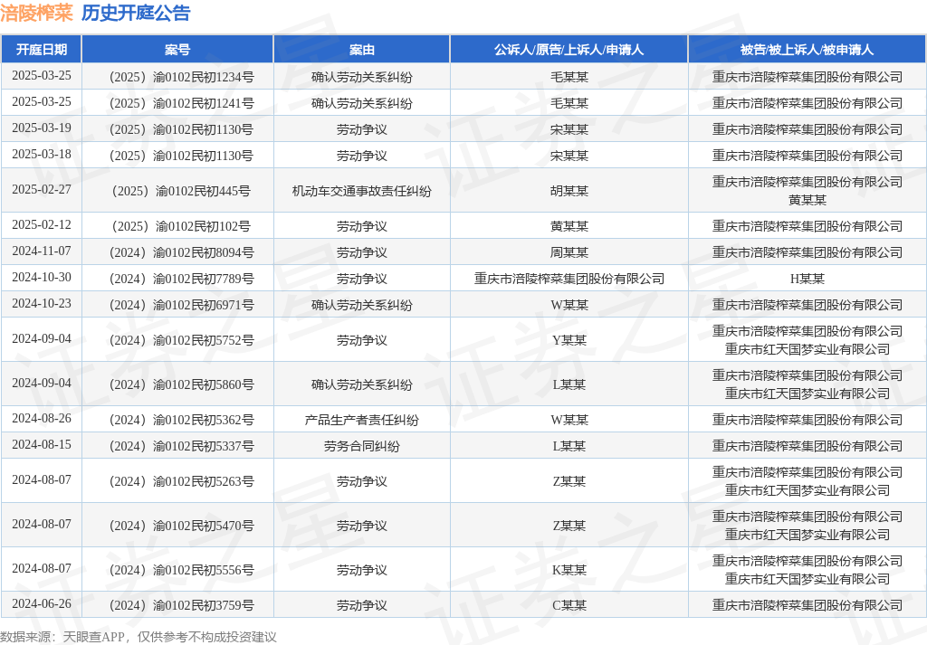 案号:(2025)渝0102民初445号根据统计,近一年内以重庆市涪陵榨菜集团股份有限公司为当事人的历史开庭公告有17则,其中案由为“劳动争议”的公告以10则居首,其次为“确认劳动关系纠纷”有4则,“产品生产者责任纠纷”有1则。历史开庭公告如下: