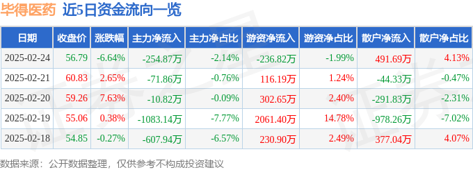 证券之星消息,截至2025年2月24日收盘,毕得医药(688073)报收于56.79元,下跌6.64%,换手率4.81%,成交量2.08万手,成交额1.19亿元。