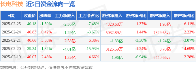 证券之星消息,截至2025年2月25日收盘,长电科技(600584)报收于40.18元,下跌1.59%,换手率4.36%,成交量77.99万手,成交额31.59亿元。