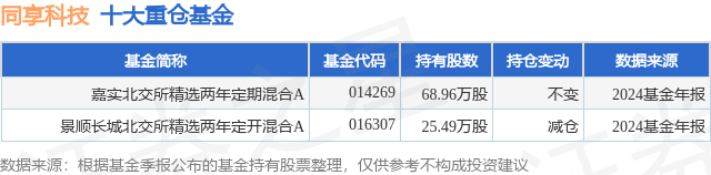 根据2024基金年报公募基金重仓股数据,重仓该股的公募基金共2家,其中持有数量最多的公募基金为嘉实北交所精选两年定期混合A。嘉实北交所精选两年定期混合A目前规模为2.32亿元,最新净值0.8841(2月25日),较上一交易日下跌1.62%,近一年上涨43.36%。该公募基金现任基金经理为刘杰 李涛。刘杰在任的基金产品包括:嘉实先进制造股票,管理时间为2021年5月27日至今,期间收益率为-19.98%;嘉实全球产业升级股票发起式(QDII)A,管理时间为2023年2月9日至今,期间收益率为80.39%;嘉实碳中和主题混合A,管理时间为2023年3月31日至今,期间收益率为23.32%。李涛在任的基金产品包括:嘉实清洁能源股票发起式A,管理时间为2022年11月22日至今,期间收益率为-27.06%;嘉实积极配置一年持有混合A,管理时间为2022年11月29日至今,期间收益率为6.96%;嘉实信息产业股票发起式A,管理时间为2022年12月16日至今,期间收益率为68.43%。