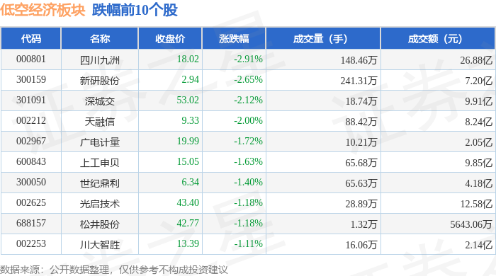 证券之星消息,2月26日低空经济板块较上一交易日上涨0.16%,数字政通领涨。当日上证指数报收于3380.21,上涨1.02%。深证成指报收于10955.65,上涨0.93%。低空经济板块个股涨跌见下表: