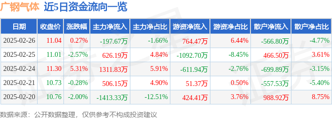 2月26日的资金流向数据方面,主力资金净流出197.67万元,占总成交额1.66%,游资资金净流入764.47万元,占总成交额6.44%,散户资金净流出566.8万元,占总成交额4.77%。