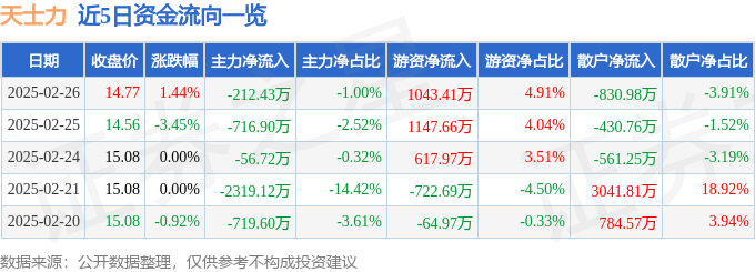 2月26日的资金流向数据方面,主力资金净流出212.43万元,占总成交额1.0%,游资资金净流入1043.41万元,占总成交额4.91%,散户资金净流出830.98万元,占总成交额3.91%。