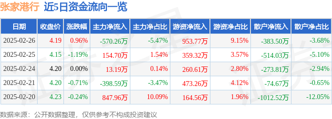 证券之星消息,截至2025年2月26日收盘,张家港行(002839)报收于4.19元,上涨0.96%,换手率1.02%,成交量24.95万手,成交额1.04亿元。