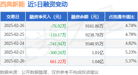 证券之星消息,2月26日,西典新能(603312)融资买入887.52万元,融资偿还964.44万元,融资净卖出76.92万元,融资余额9161.86万元。