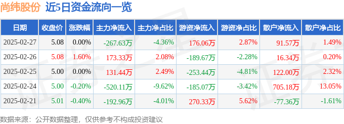 2月27日的资金流向数据方面,主力资金净流出267.63万元,占总成交额4.36%,游资资金净流入176.06万元,占总成交额2.87%,散户资金净流入91.57万元,占总成交额1.49%。