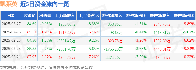 证券之星消息,截至2025年2月27日收盘,凯莱英(002821)报收于84.69元,下跌0.96%,换手率0.85%,成交量2.81万手,成交额2.37亿元。
