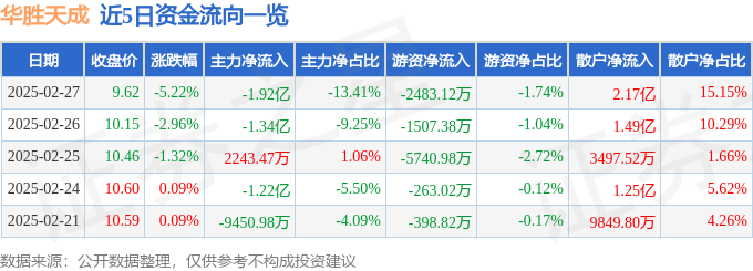 证券之星消息,截至2025年2月27日收盘,华胜天成(600410)报收于9.62元,下跌5.22%,换手率13.29%,成交量145.71万手,成交额14.29亿元。