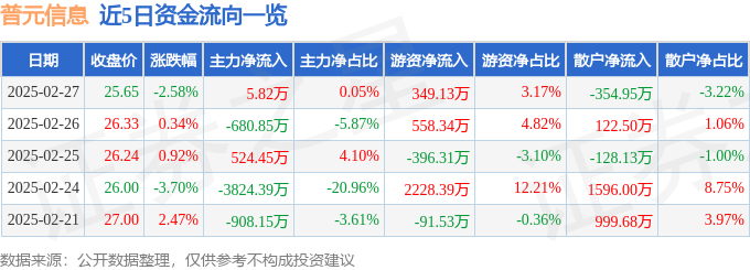 证券之星消息,截至2025年2月27日收盘,普元信息(688118)报收于25.65元,下跌2.58%,换手率4.57%,成交量4.3万手,成交额1.1亿元。
