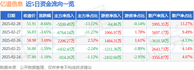 证券之星消息,截至2025年2月28日收盘,亿道信息(001314)报收于51.91元,下跌8.66%,换手率16.34%,成交量8.45万手,成交额4.52亿元。