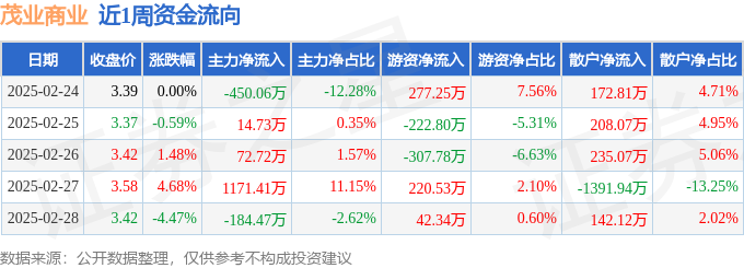 资金流向数据方面,本周茂业商业主力资金合计净流入624.32万元,游资资金合计净流入9.54万元,散户资金合计净流出633.86万元。本周资金流向一览见下表: