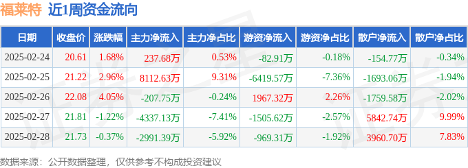 资金流向数据方面,本周福莱特主力资金合计净流入814.05万元,游资资金合计净流出7010.09万元,散户资金合计净流入6196.04万元。本周资金流向一览见下表: