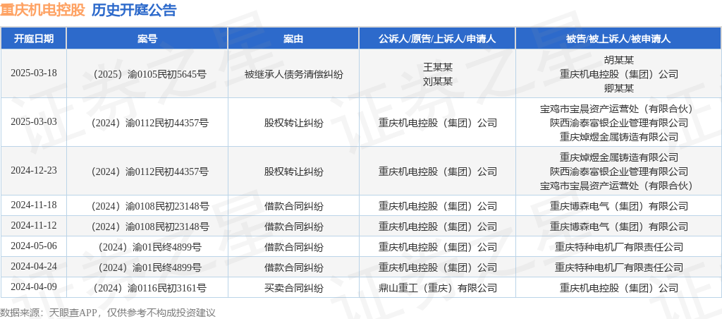 案号:(2024)渝0112民初44357号根据统计,近一年内以重庆机电控股(集团)公司为当事人的历史开庭公告有8则,其中案由为“借款合同纠纷”的公告以4则居首,其次为“股权转让纠纷”有2则,“买卖合同纠纷”有1则。历史开庭公告如下: