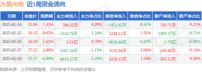 资金流向数据方面,本周水晶光电主力资金合计净流入1.11亿元,游资资金合计净流入6536.84万元,散户资金合计净流出1.76亿元。本周资金流向一览见下表: