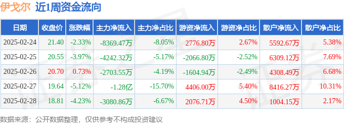 资金流向数据方面,本周伊戈尔主力资金合计净流出3.12亿元,游资资金合计净流入5587.78万元,散户资金合计净流入2.56亿元。本周资金流向一览见下表: