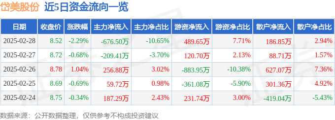 2月28日的资金流向数据方面,主力资金净流出676.5万元,占总成交额10.65%,游资资金净流入489.65万元,占总成交额7.71%,散户资金净流入186.85万元,占总成交额2.94%。
