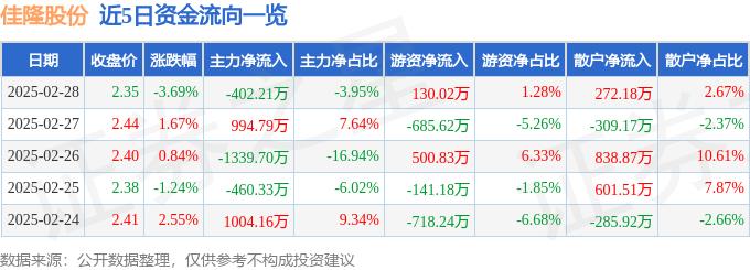 证券之星消息,截至2025年2月28日收盘,佳隆股份(002495)报收于2.35元,下跌3.69%,换手率5.94%,成交量42.43万手,成交额1.02亿元。