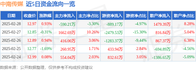 证券之星消息,截至2025年2月28日收盘,中南传媒(601098)报收于12.97元,上涨0.93%,换手率0.76%,成交量13.72万手,成交额1.79亿元。
