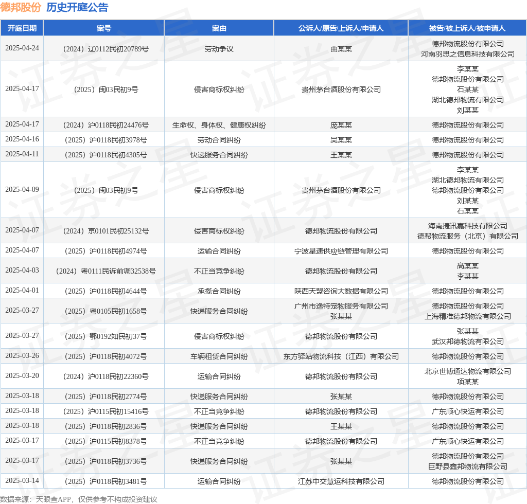 案号:(2025)沪0115民初15920号根据统计,近一年内以德邦物流股份有限公司为当事人的历史开庭公告有381则,其中案由为“快递服务合同纠纷”的公告以111则居首,其次为“运输合同纠纷”有107则,“劳动合同纠纷”有20则。历史开庭公告(前20条)如下: