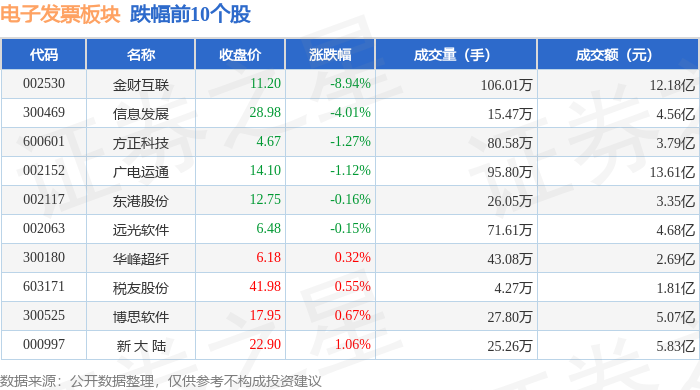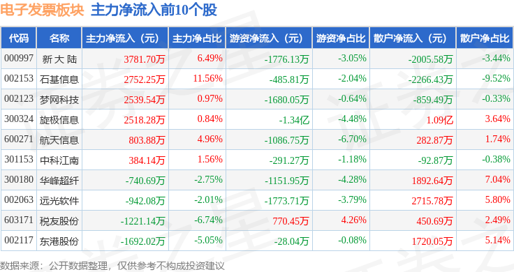 从资金流向上来看,当日电子发票板块主力资金净流出2.98亿元,游资资金净流出1.63亿元,散户资金净流入4.61亿元。电子发票板块个股资金流向见下表: