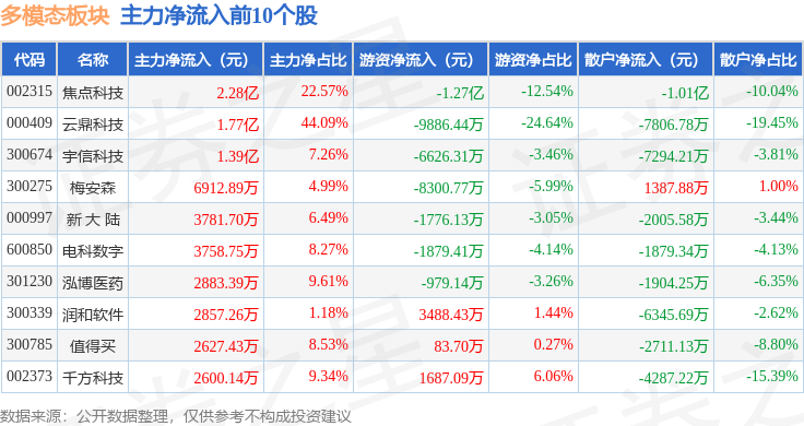 从资金流向上来看,当日多模态板块主力资金净流出20.43亿元,游资资金净流出1.77亿元,散户资金净流入22.2亿元。多模态板块个股资金流向见下表: