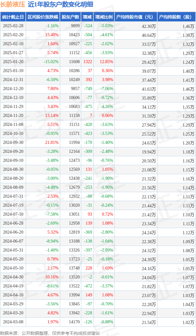 从股价来看,2025年2月20日至2025年2月28日,长龄液压区间跌幅为1.16%,在此期间股东户数减少524.0户,减幅为5.03%。