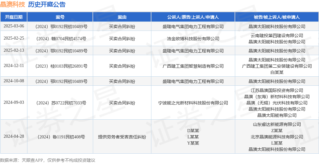 根据统计,近一年内以晶澳太阳能科技股份有限公司为当事人的历史开庭公告有7则,其中案由为“买卖合同纠纷”的公告以6则居首,其次为“提供劳务者受害责任纠纷”有1则。历史开庭公告如下: