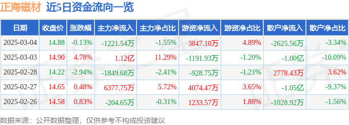 证券之星消息,截至2025年3月4日收盘,正海磁材(300224)报收于14.88元,下跌0.13%,换手率6.36%,成交量52.91万手,成交额7.86亿元。