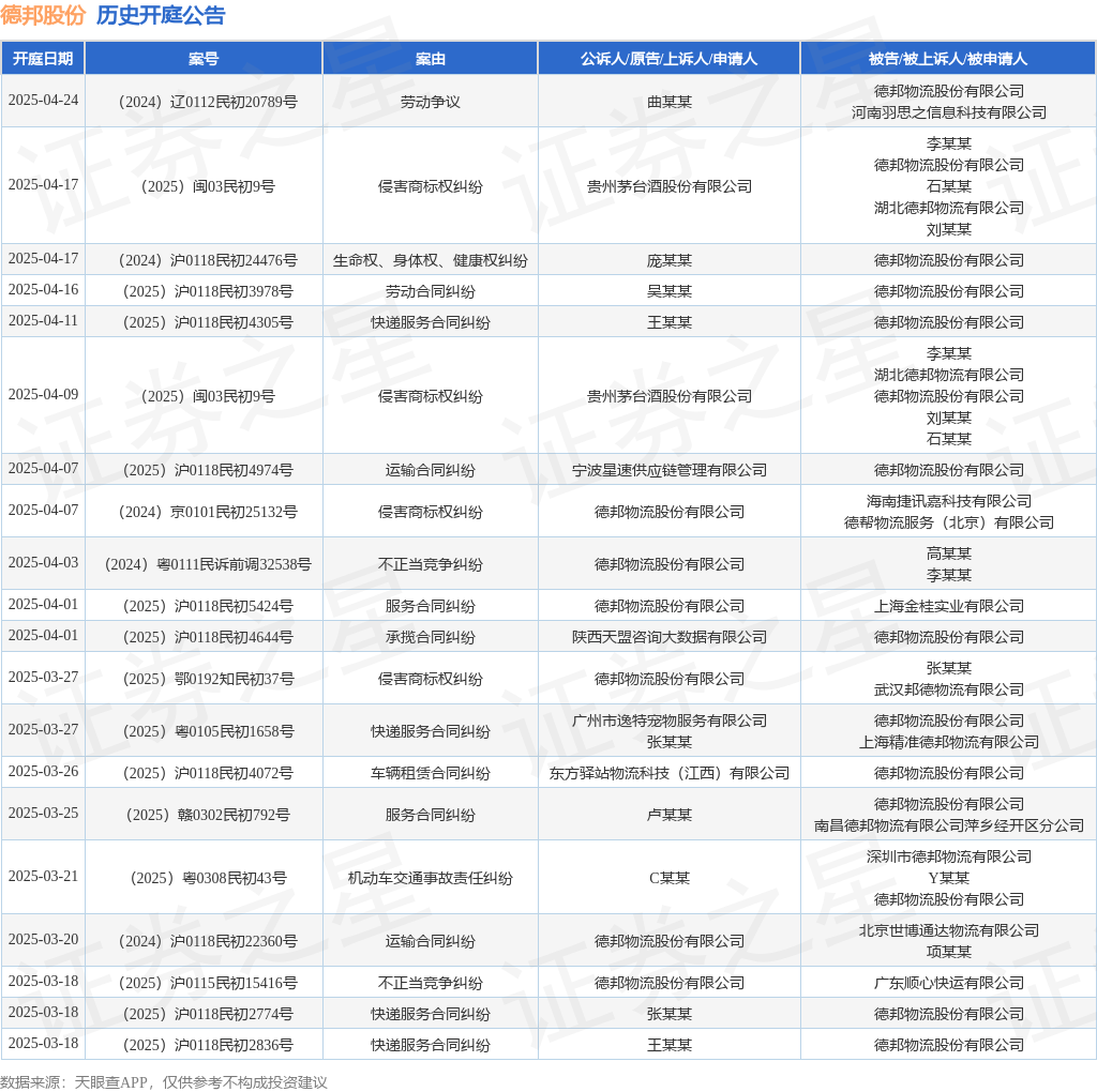 案号:(2025)沪0118民初1576号根据统计,近一年内以德邦物流股份有限公司为当事人的历史开庭公告有384则,其中案由为“快递服务合同纠纷”的公告以111则居首,其次为“运输合同纠纷”有107则,“劳动合同纠纷”有20则。历史开庭公告(前20条)如下: