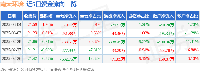 证券之星消息,截至2025年3月4日收盘,南大环境(300864)报收于21.59元,上涨1.7%,换手率0.7%,成交量1.09万手,成交额2329.82万元。