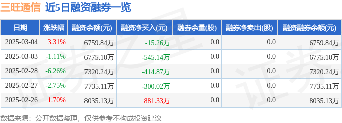 三旺通信融资融券信息显示,融资方面,当日融资买入238.43万元,融资偿还253.69万元,融资净偿还15.26万元。融券方面,融券卖出0.0股,融券偿还0.0股,融券余量0.0股,融券余额0.0万元。融资融券余额6759.84万元。