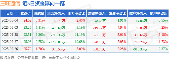 证券之星消息,截至2025年3月4日收盘,三旺通信(688618)报收于24.02元,上涨3.31%,换手率0.98%,成交量1.08万手,成交额2549.42万元。