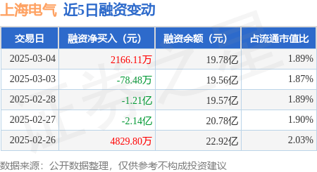 证券之星消息,3月4日,上海电气(601727)融资买入1.55亿元,融资偿还1.33亿元,融资净买入2166.11万元,融资余额19.78亿元。