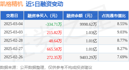 证券之星消息,3月4日,凯格精机(301338)融资买入303.98万元,融资偿还638.69万元,融资净卖出334.71万元,融资余额9998.62万元。