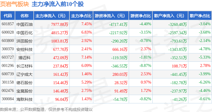 从资金流向上来看,当日页岩气板块主力资金净流出3461.79万元,游资资金净流出4337.62万元,散户资金净流入7799.41万元。页岩气板块个股资金流向见下表: