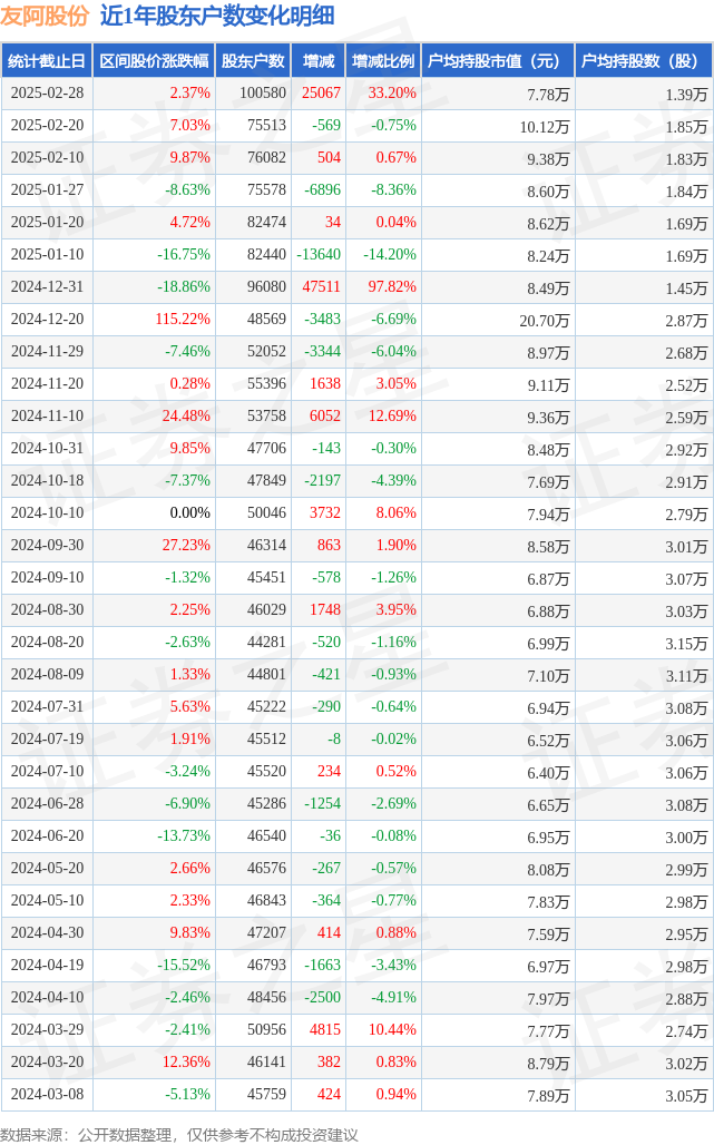从股价来看,2025年2月20日至2025年2月28日,友阿股份区间涨幅为2.37%,在此期间股东户数增加2.51万户,增幅为33.2%。