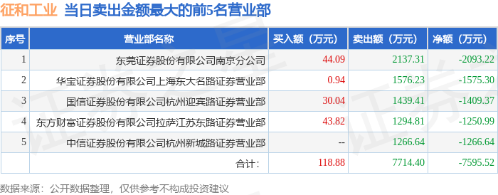 证券之星消息,沪深交易所2025年3月5日公布的交易公开信息显示,征和工业(003033)因日振幅值达到15%的前5只证券,日跌幅偏离值达到7%的前5只证券登上龙虎榜。此次是近5个交易日内第2次上榜。