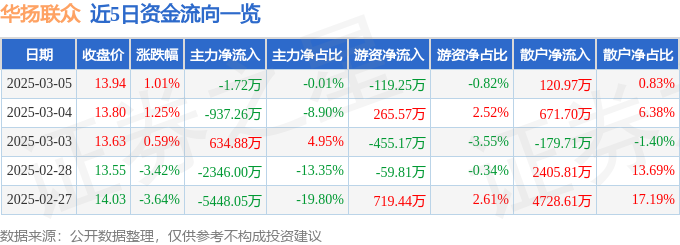 证券之星消息,截至2025年3月5日收盘,华扬联众(603825)报收于13.94元,上涨1.01%,换手率4.18%,成交量10.6万手,成交额1.46亿元。