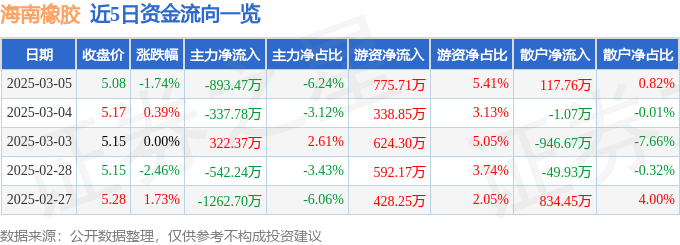 证券之星消息,截至2025年3月5日收盘,海南橡胶(601118)报收于5.08元,下跌1.74%,换手率0.66%,成交量28.27万手,成交额1.43亿元。
