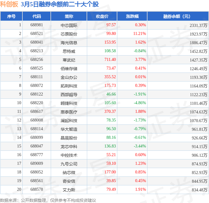 科创板融券余额前三分别为:中芯国际(688981)融券余额2331.37万元、芯原股份(688521)融券余额1923.97万元、海光信息(688041)融券余额1886.47万元,前20具体见下表: