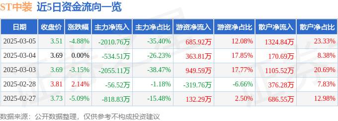3月5日的资金流向数据方面,主力资金净流出2010.76万元,占总成交额35.4%,游资资金净流入685.92万元,占总成交额12.08%,散户资金净流入1324.84万元,占总成交额23.33%。
