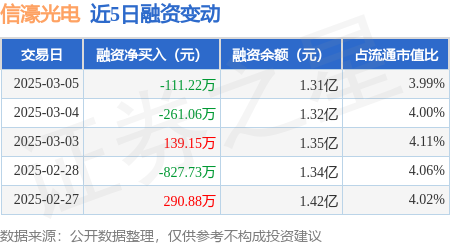 证券之星消息,3月5日,信濠光电(301051)融资买入272.47万元,融资偿还383.69万元,融资净卖出111.22万元,融资余额1.31亿元。