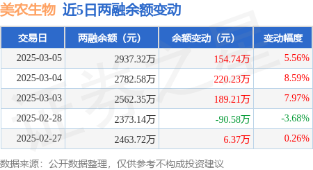 证券之星消息,3月5日,美农生物(301156)融资买入405.89万元,融资偿还251.15万元,融资净买入154.74万元,融资余额2937.32万元,近3个交易日已连续净买入累计564.18万元,近20个交易日中有11个交易日出现融资净买入。