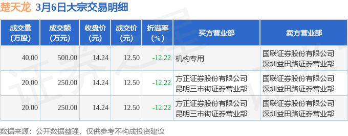 证券之星消息,3月6日楚天龙发生大宗交易,交易数据如下: