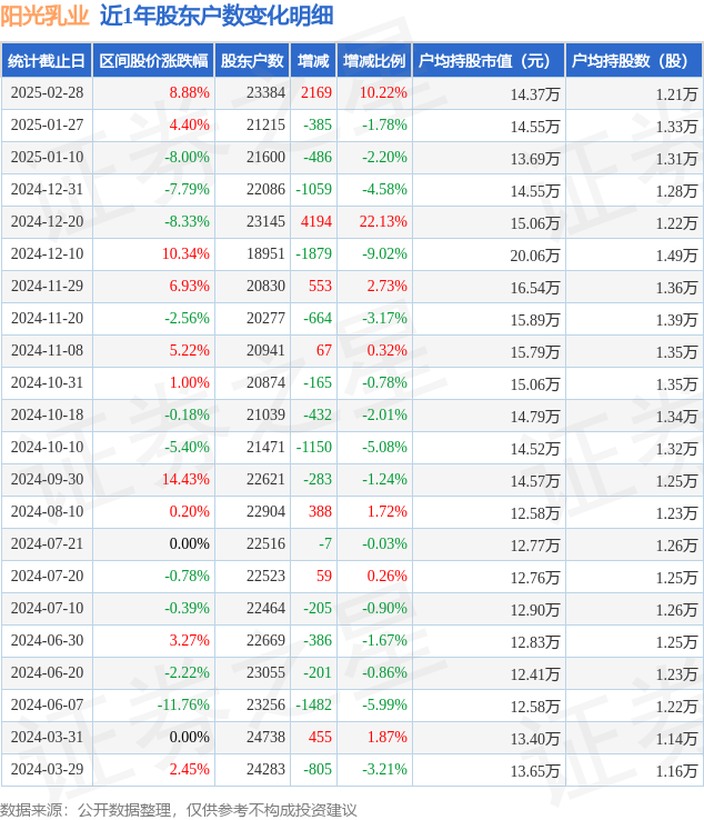 从股价来看,2025年1月27日至2025年2月28日,阳光乳业区间涨幅为8.88%,在此期间股东户数增加2169.0户,增幅为10.22%。