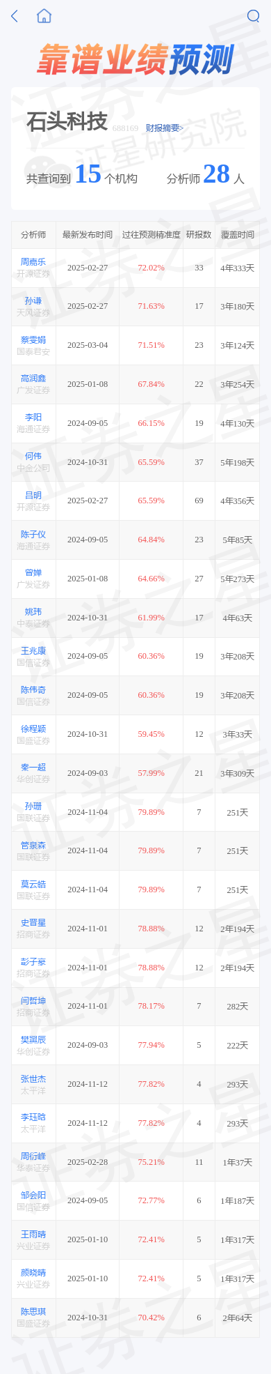 如果您对这家公司感兴趣,可以参考证星研究院统计的石头科技的分析师业绩预测数据,其中根据开源证券的分析师周嘉乐预测公司未来PE为16.0(更多特色估值数据尽在证星研究院,所有数据均来源公开资料,期且所有资料都存在一定时间滞后,所有相关数据均不可作为投资决策单一依据)。
