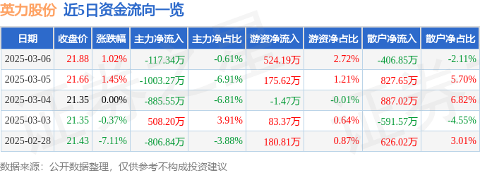 3月6日的资金流向数据方面,主力资金净流出117.34万元,占总成交额0.61%,游资资金净流入524.19万元,占总成交额2.72%,散户资金净流出406.85万元,占总成交额2.11%。