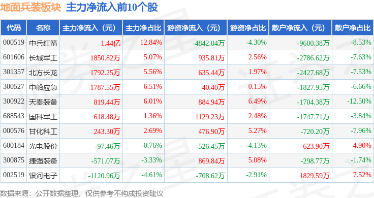 从资金流向上来看,当日地面兵装板块主力资金净流入1.54亿元,游资资金净流出161.5万元,散户资金净流出1.53亿元。地面兵装板块个股资金流向见下表: